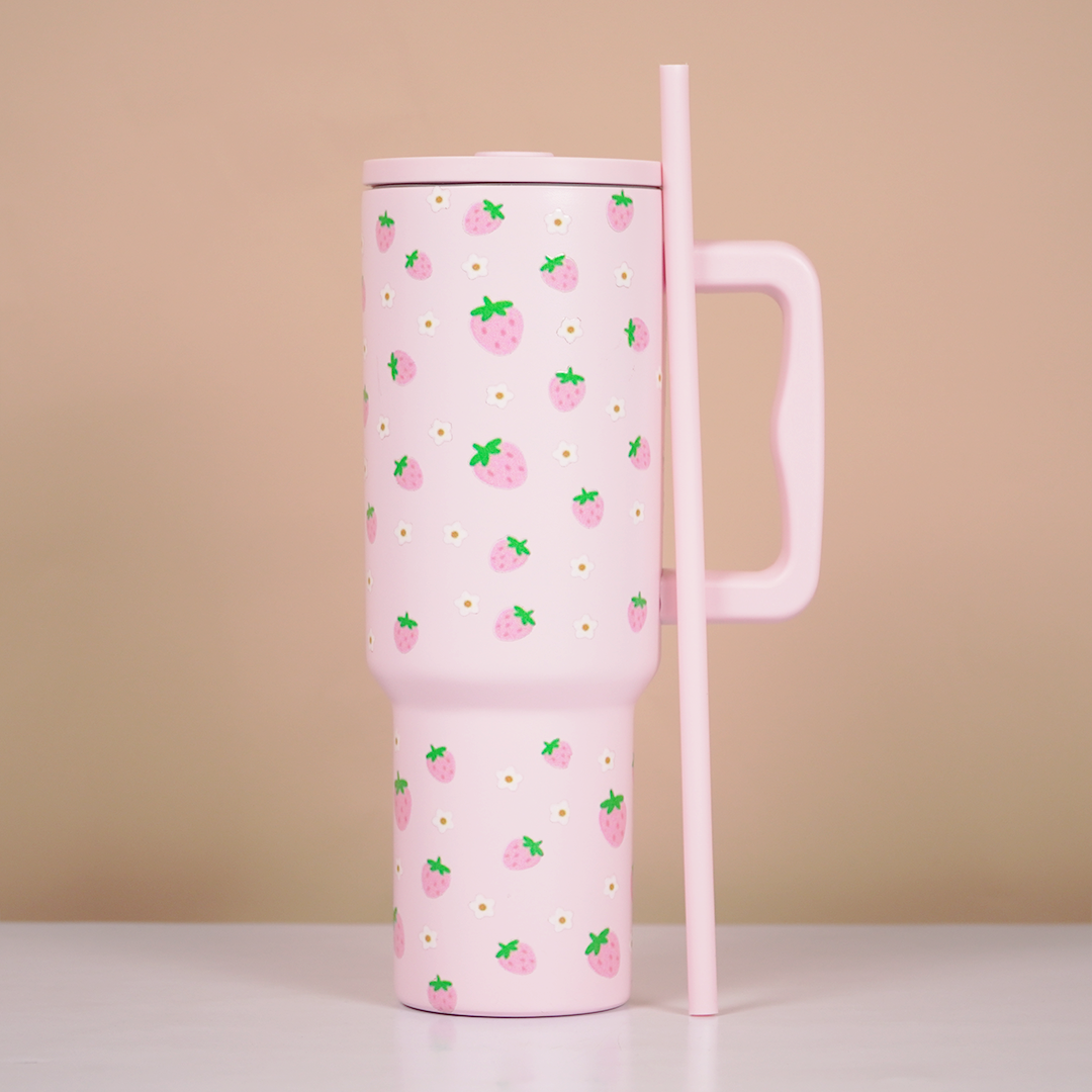 Cute Strawberry Stainless Steel Tumbler with Straw & Handle