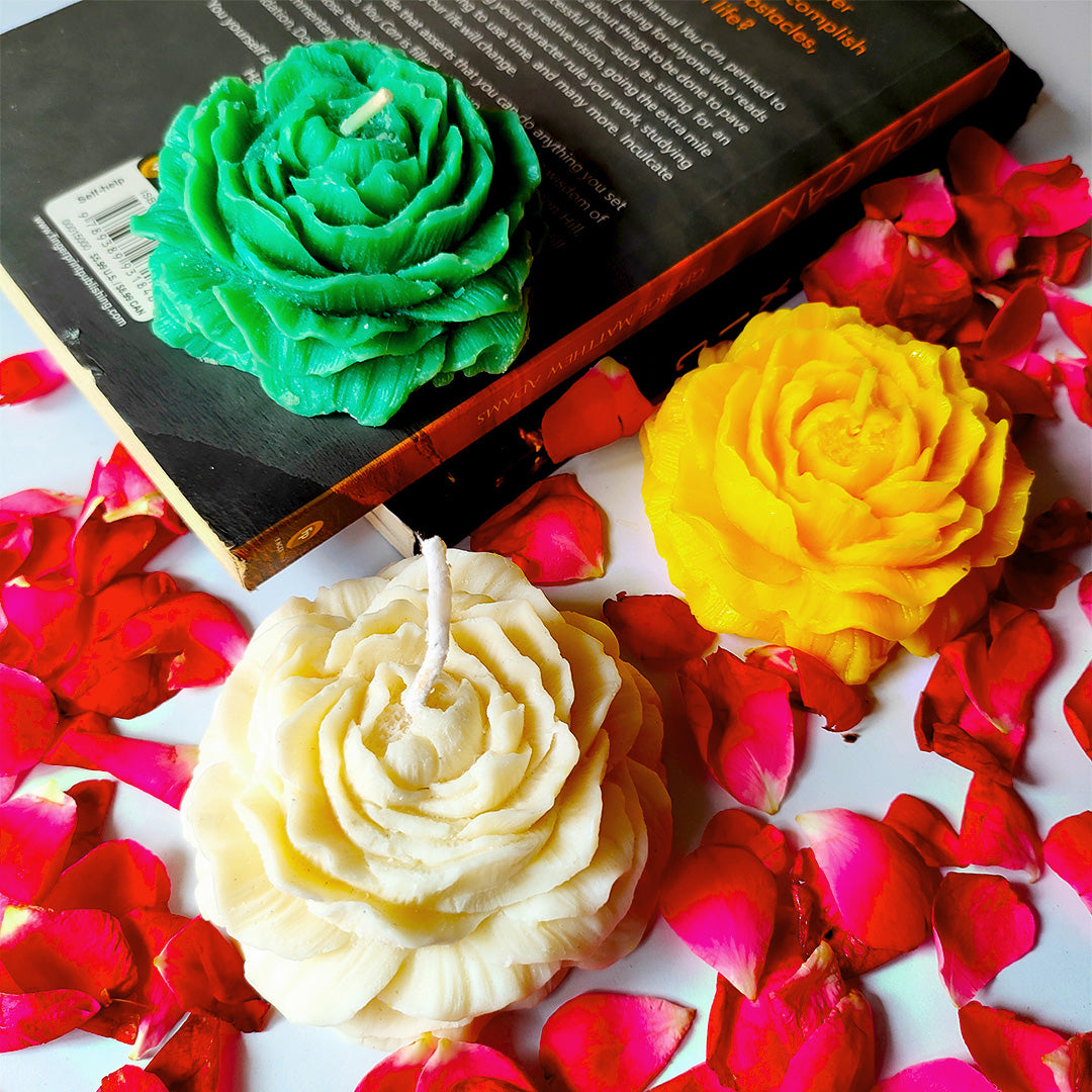 set of 3 Decorative Rose Flower Candles (White, Yellow & Green) – Perfect for Home Décor & Gifting