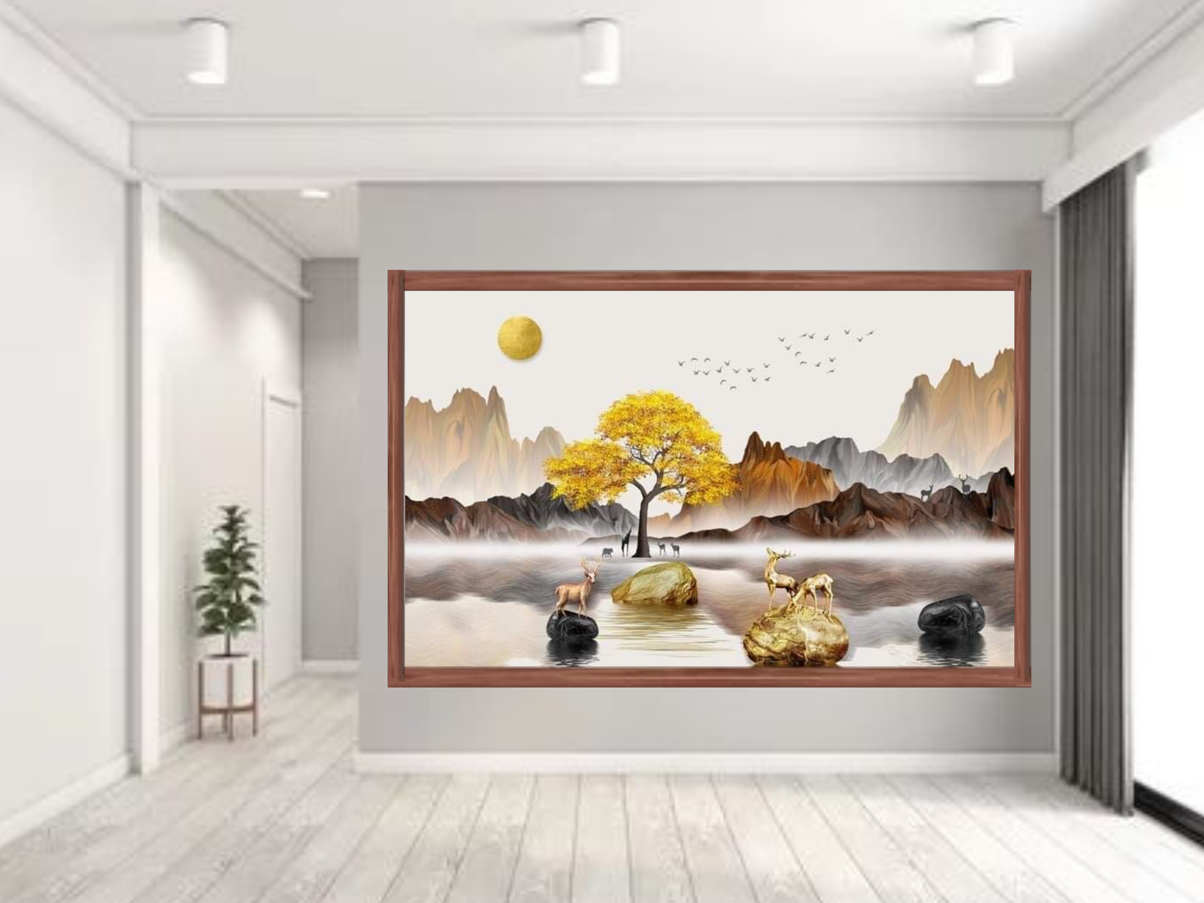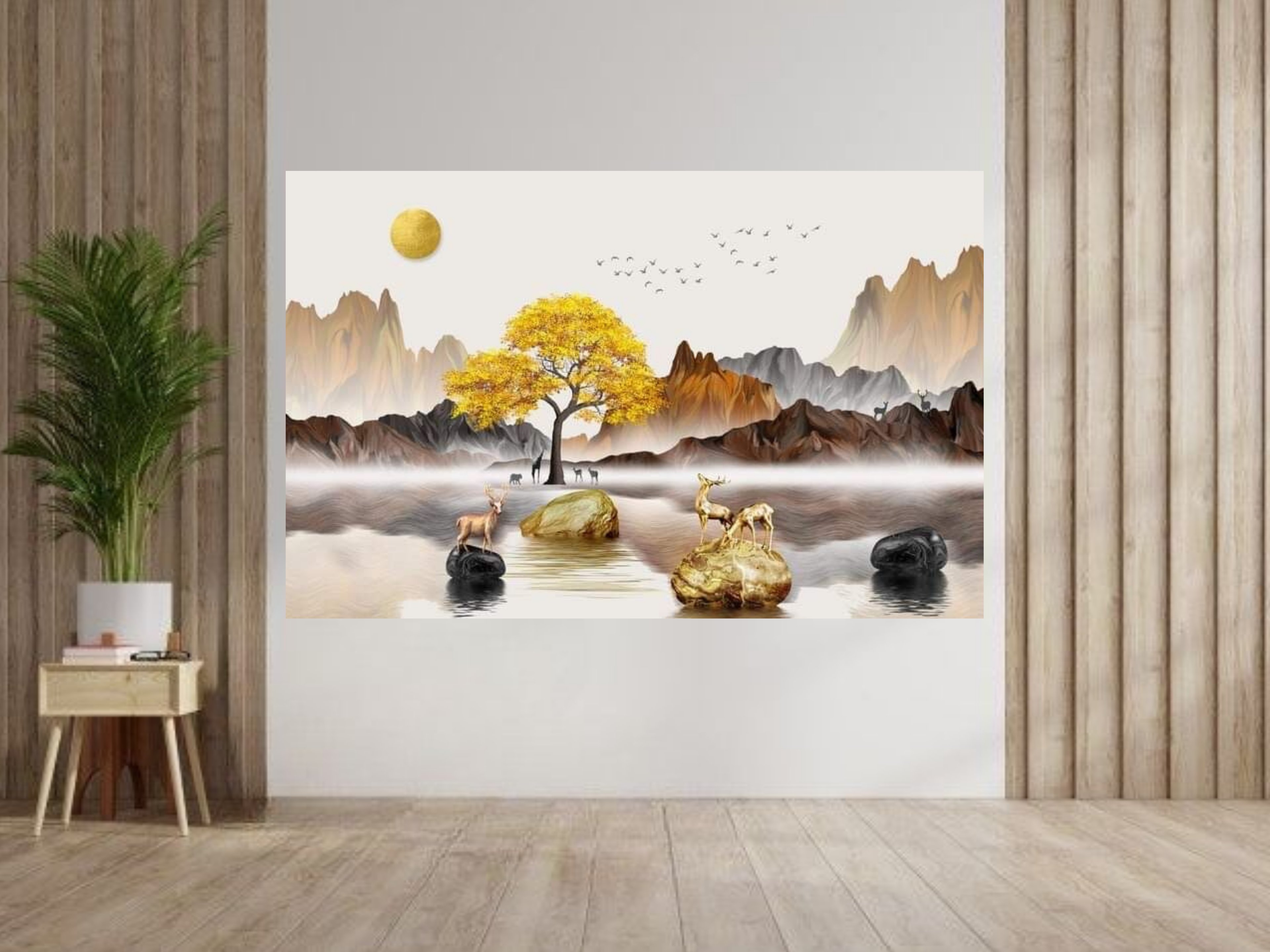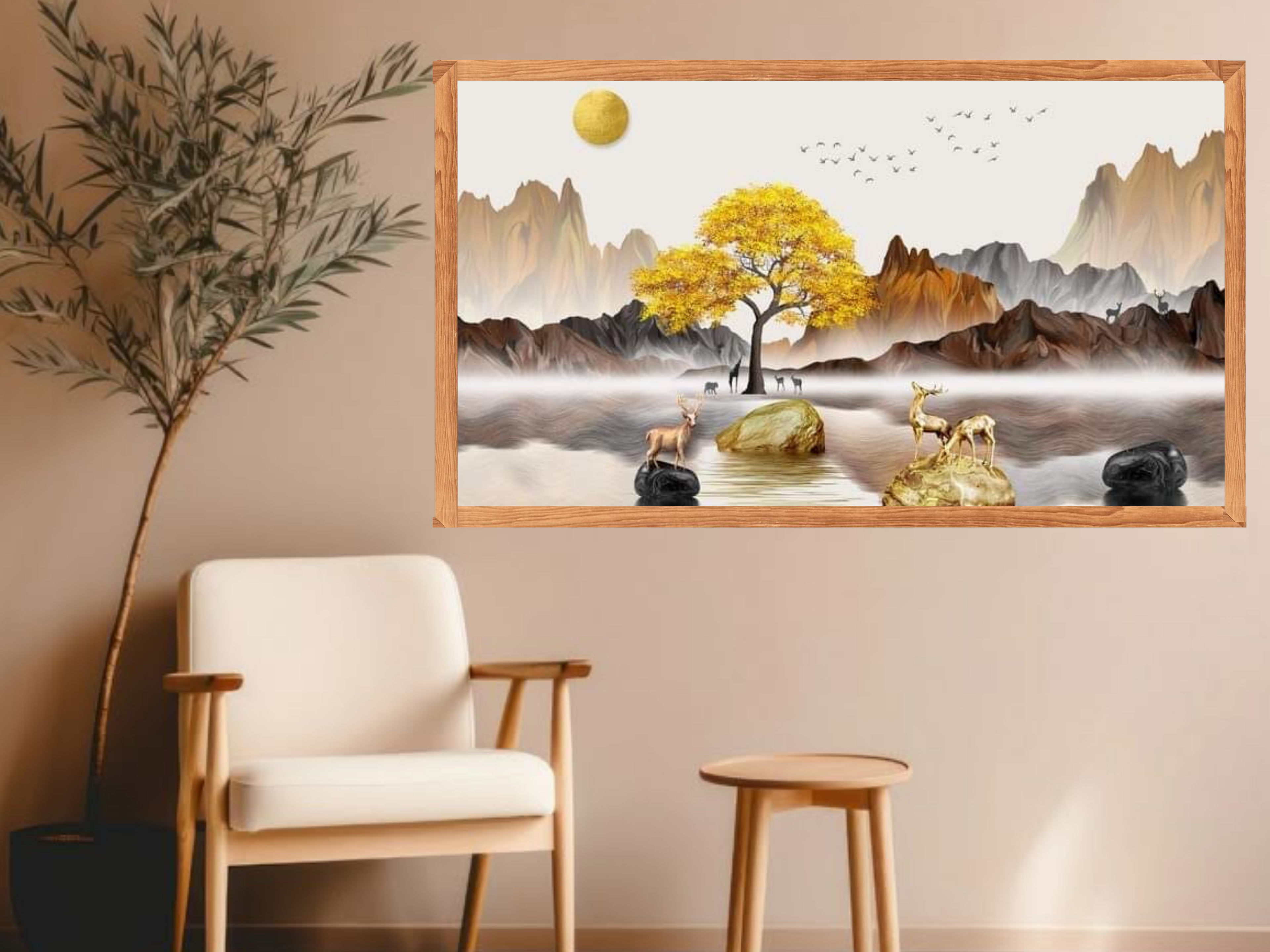 Golden Tree & Deer Landscape Canvas Wall Art – Elegant Nature-Inspired Décor