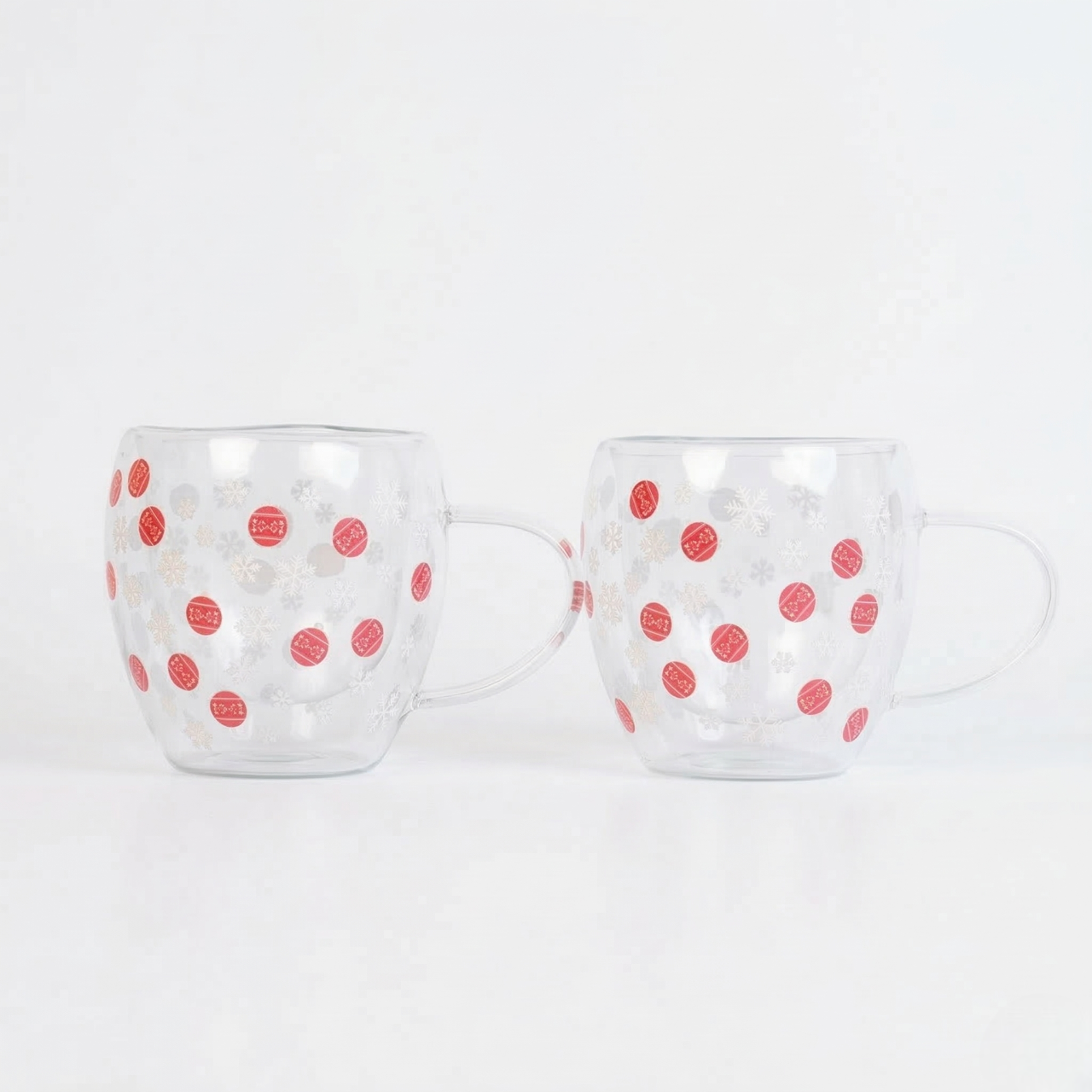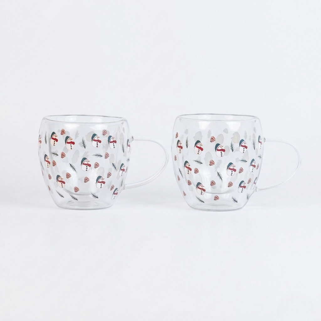 Set-2 Double Wall Glass Mug – Snowflake & Ornament Design