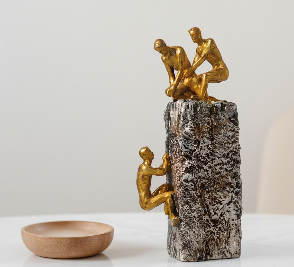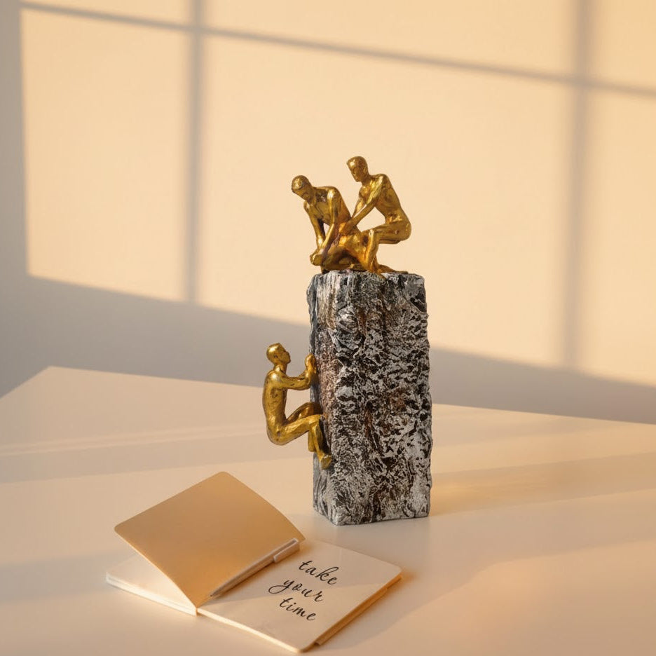 Introducing ‘AscentAura’ – the epitome of modern elegance and artistic charm for your living space. Crafted with meticulous attention to detail, this unique sculpture captures the essence of human ambition through its golden figures scaling a lifelike textured column. Perfectly sized to accentuate any room, ‘AscentAura’ adds a touch of sophistication and inspiration to your home decor collection. Its minimalist design ensures it complements various interior styles while standing out as an eye-catching centerpiece. Elevate your surroundings with ‘AscentAura’, exclusively available at memoriesinsite.com – where every piece tells a story.