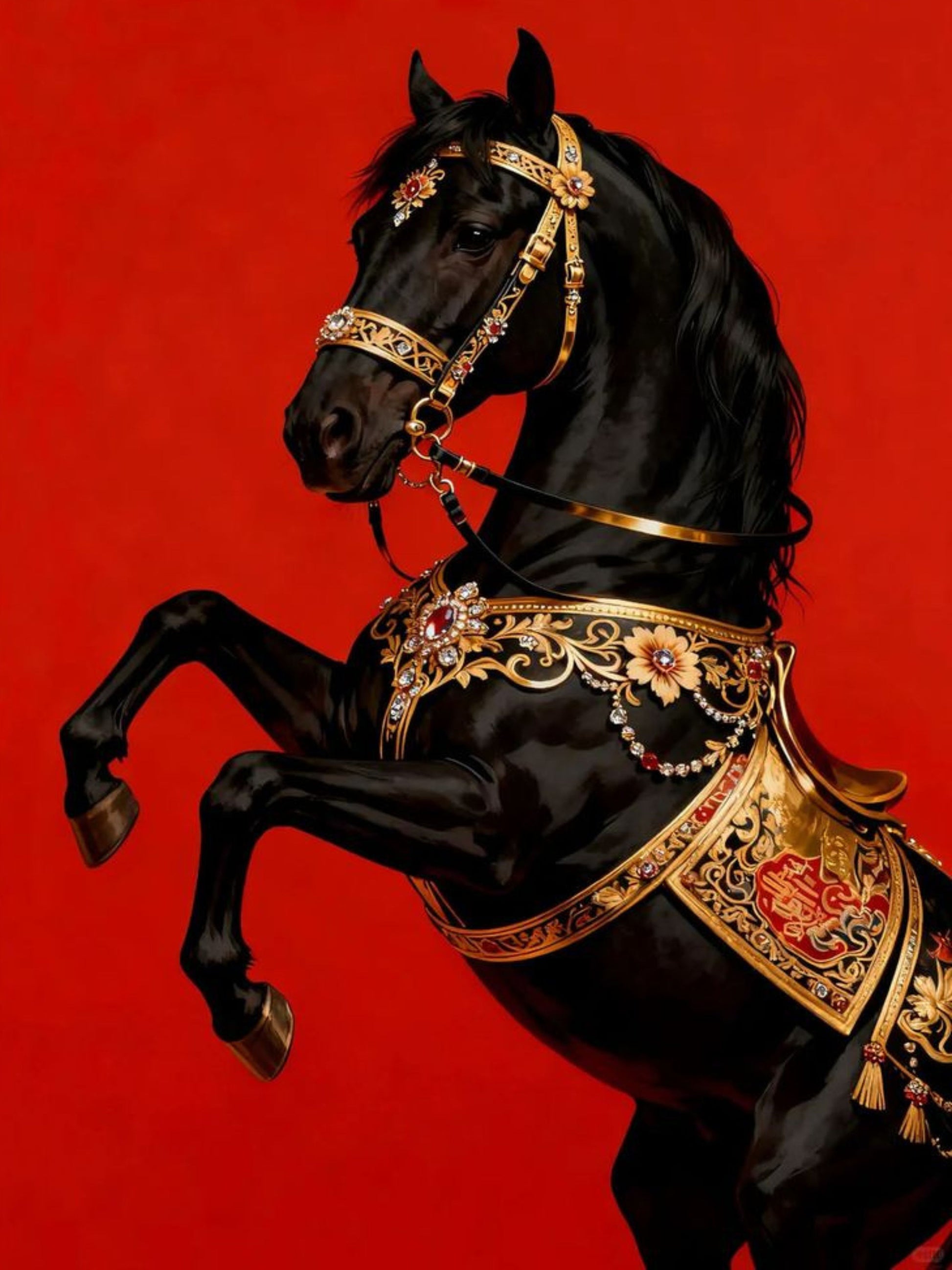 Add powerful royal elegance to your space with this black horse canvas. Its rich red backdrop and golden detailing create a bold luxury focal point.