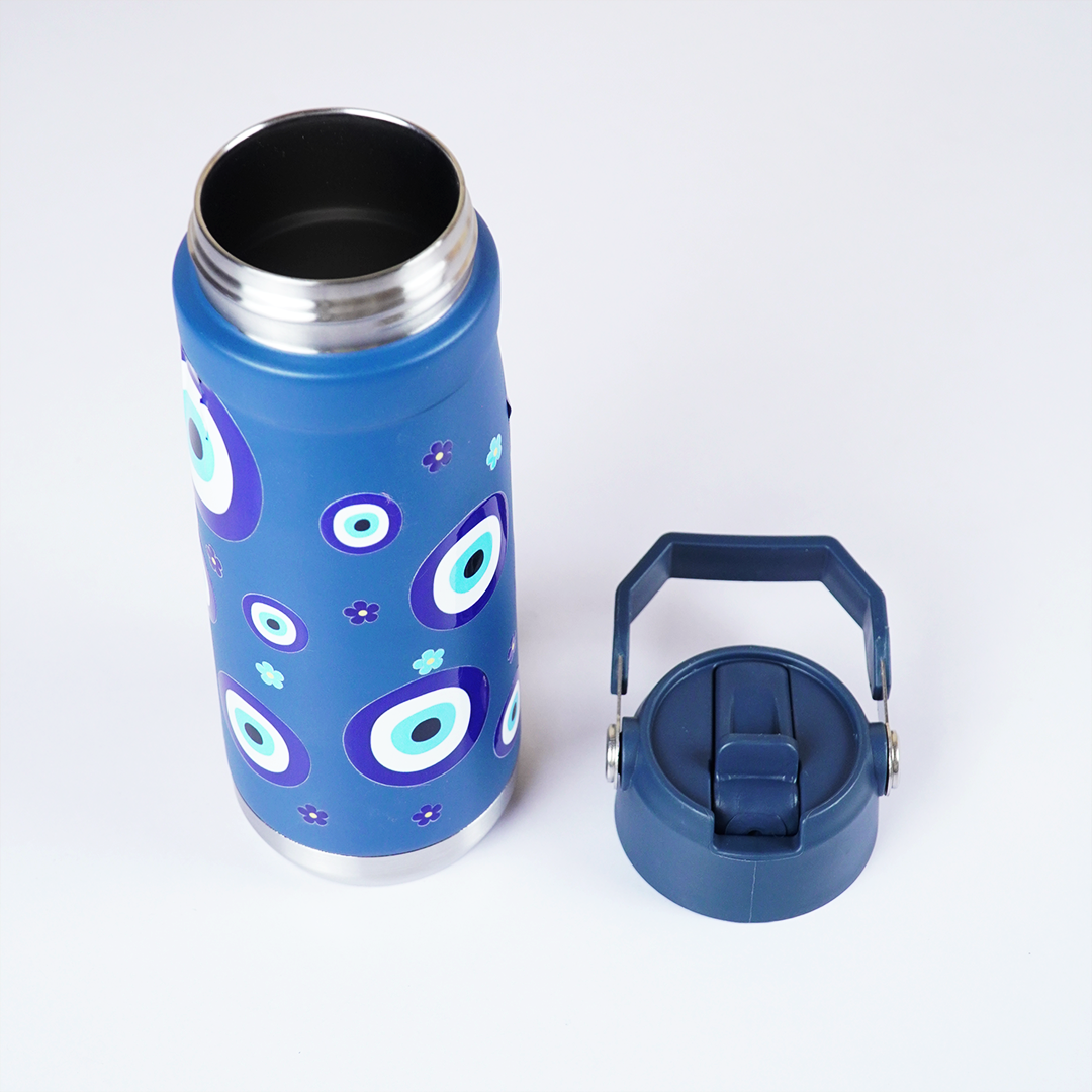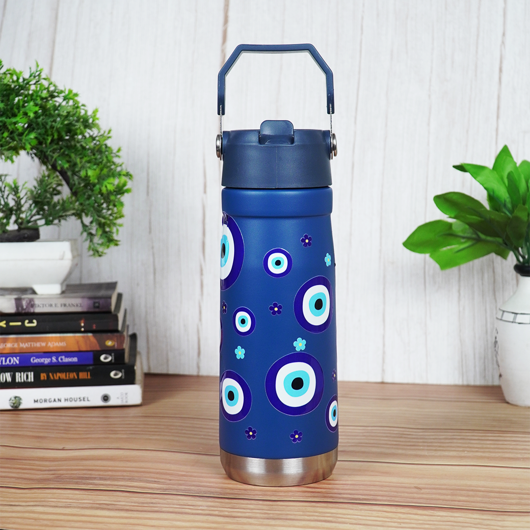 Stay hydrated in style with our Premium Evil Eye Print Stainless Steel Water Bottle. Designed with a trendy blue evil eye pattern, this bottle not only looks attractive but also keeps your drinks fresh for long hours. With a capacity of 650ml, it is perfect for school, office, gym, or travel.