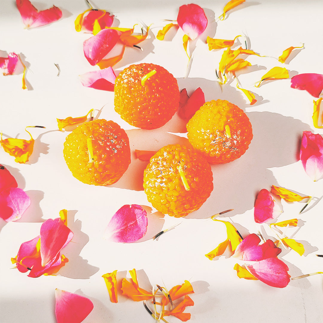 Festive ladoo-shaped candles with a glittery touch, perfect for pooja, décor, or gifting. This set of 4 adds warmth, charm, and celebration vibes to any space. ✨🪔