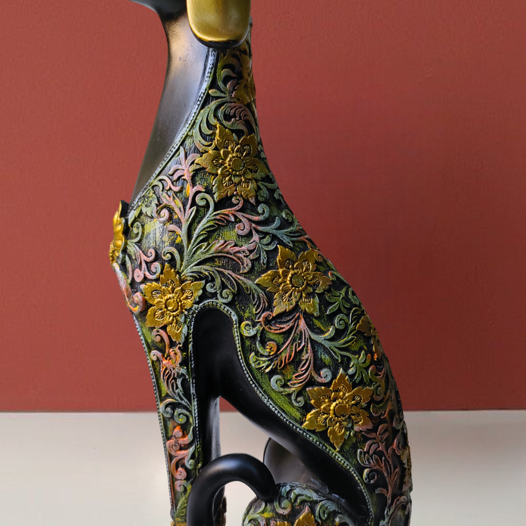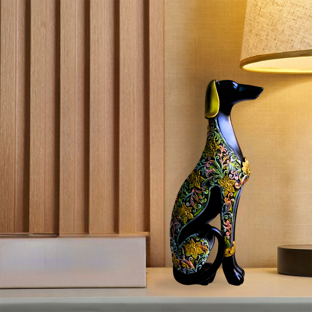Introducing ‘FloralElegance Pup’ – an exquisite addition to MemoriesInSite’s exclusive home decor collection. Crafted with meticulous attention to detail, this charming canine figurine stands proudly on its hind legs, showcasing a stunning array of hand-painted floral motifs set against a sleek black silhouette. Each curve and contour is accentuated by vibrant hues and delicate patterns, creating an eye-catching piece that exudes sophistication and style.