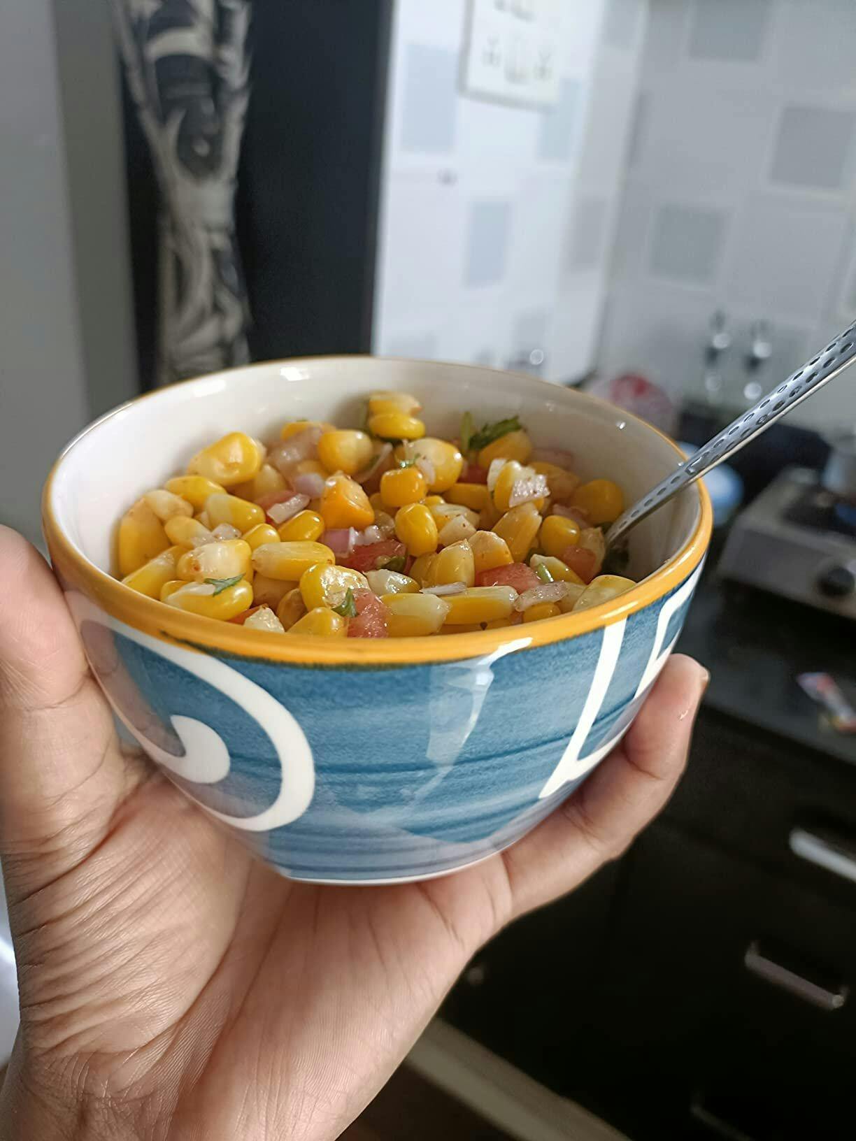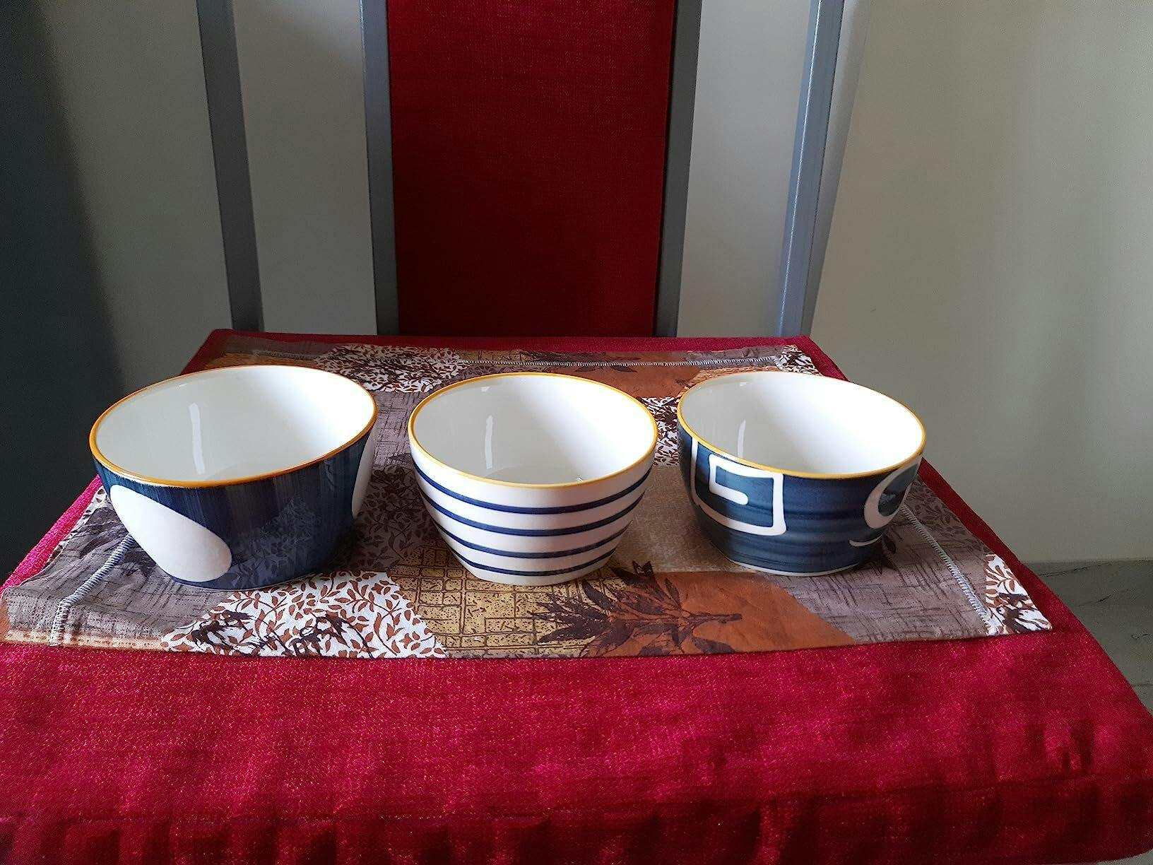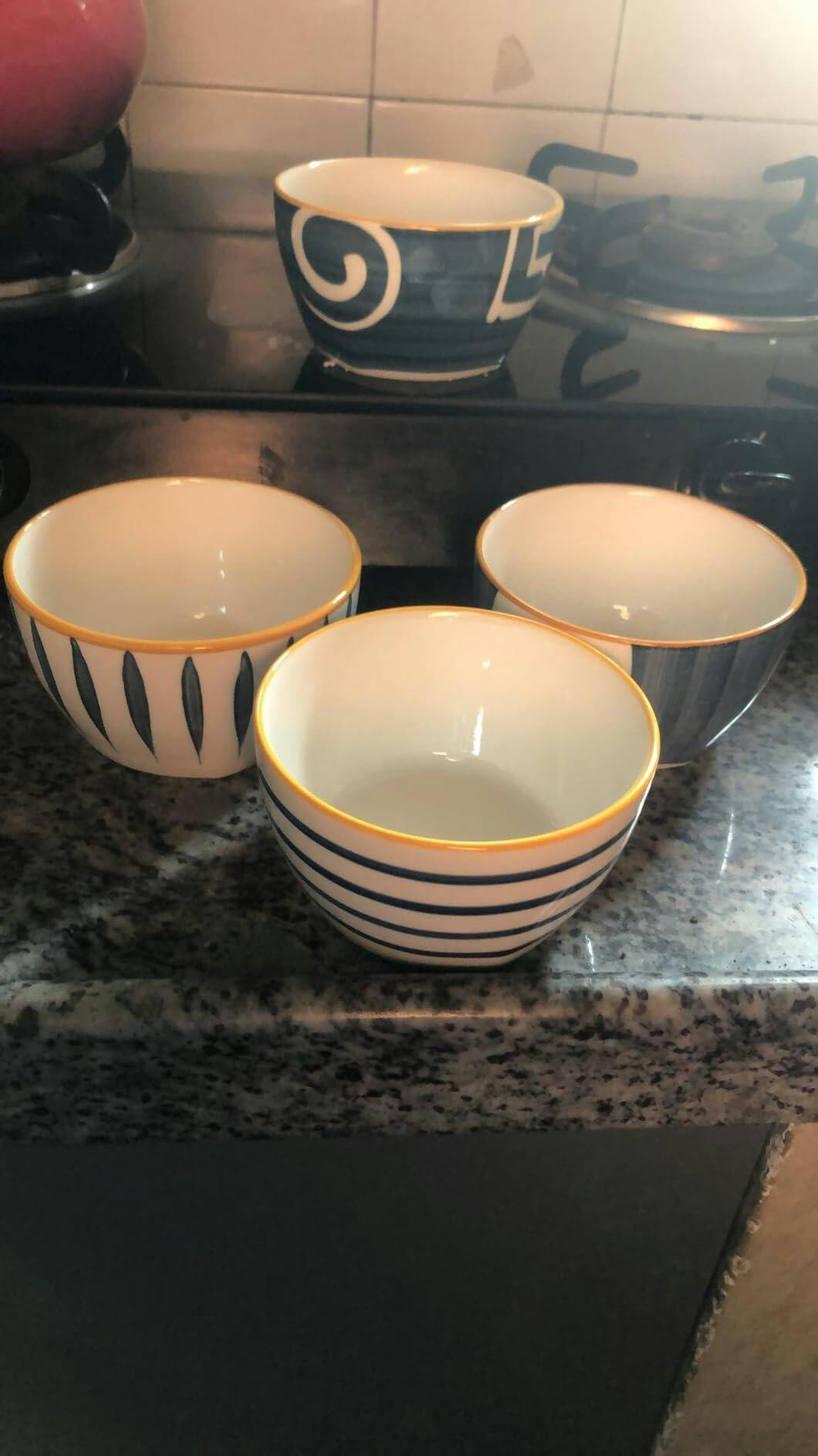 Set of 4 handcrafted blue & white ceramic bowls. Ideal for snacks, soups, and desserts. Elegant design with a golden rim finish.