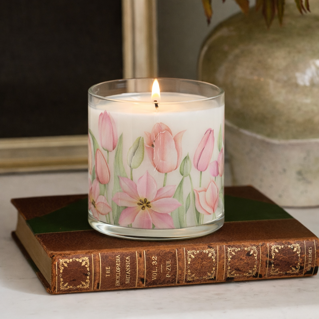 Add a soft and elegant touch to your space with this pink floral scented candle in a beautifully printed glass jar. The delicate flower design and gentle fragrance create a warm, calming atmosphere perfect for relaxation and everyday décor.