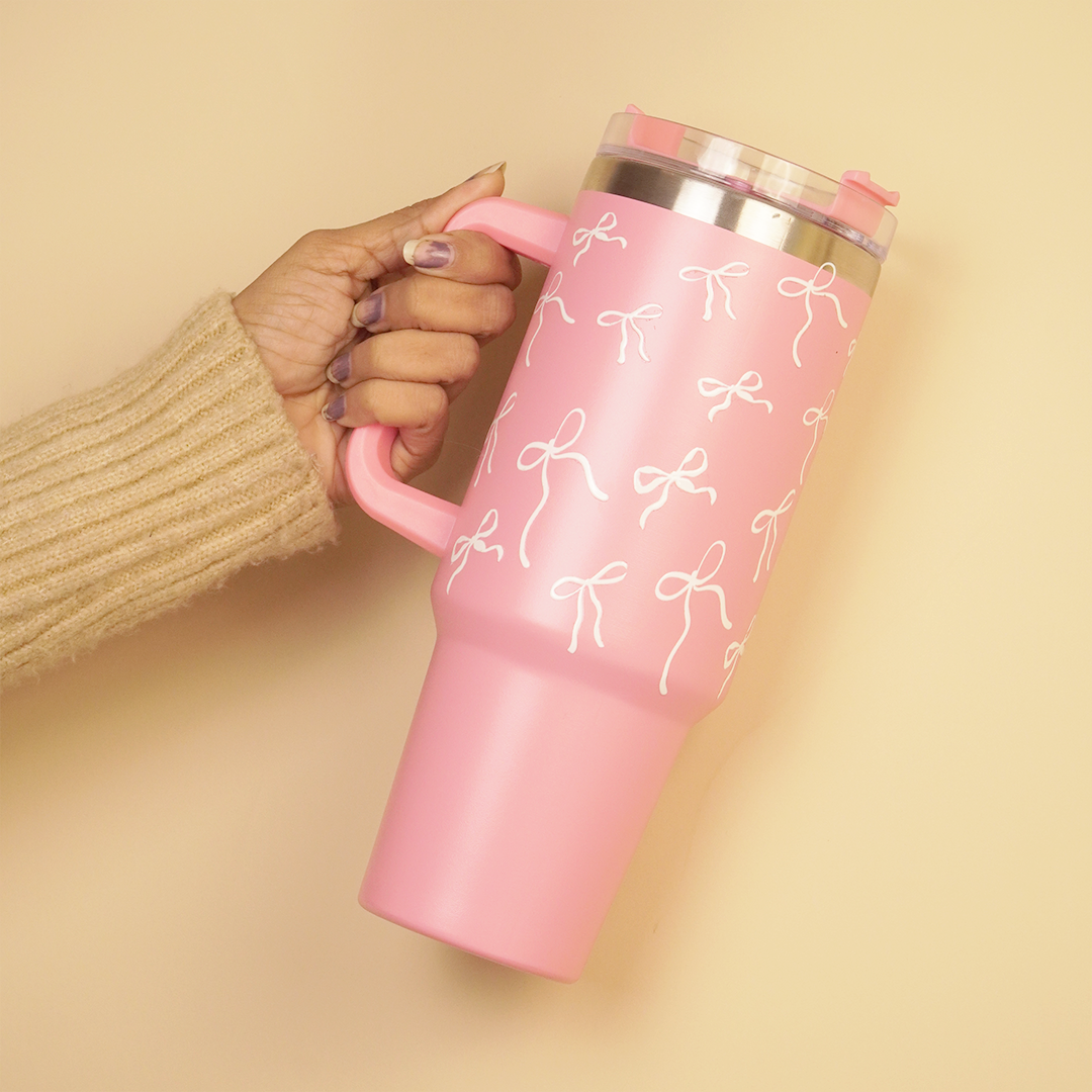 Stay hydrated in style with this 1200ml pink insulated tumbler, designed for everyday comfort and aesthetics. Made with premium stainless steel, it helps keep your drinks hot or cold for hours. The cute bow pattern, sturdy handle, and reusable straw make it perfect for home, office, gym, or travel. A trendy, practical choice for daily use or gifting.