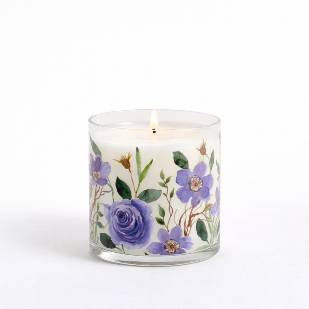 Elegant purple floral rose scented candle in a glass jar that fills your space with a soft, calming fragrance while adding a beautiful decorative touch—perfect for relaxation and gifting.