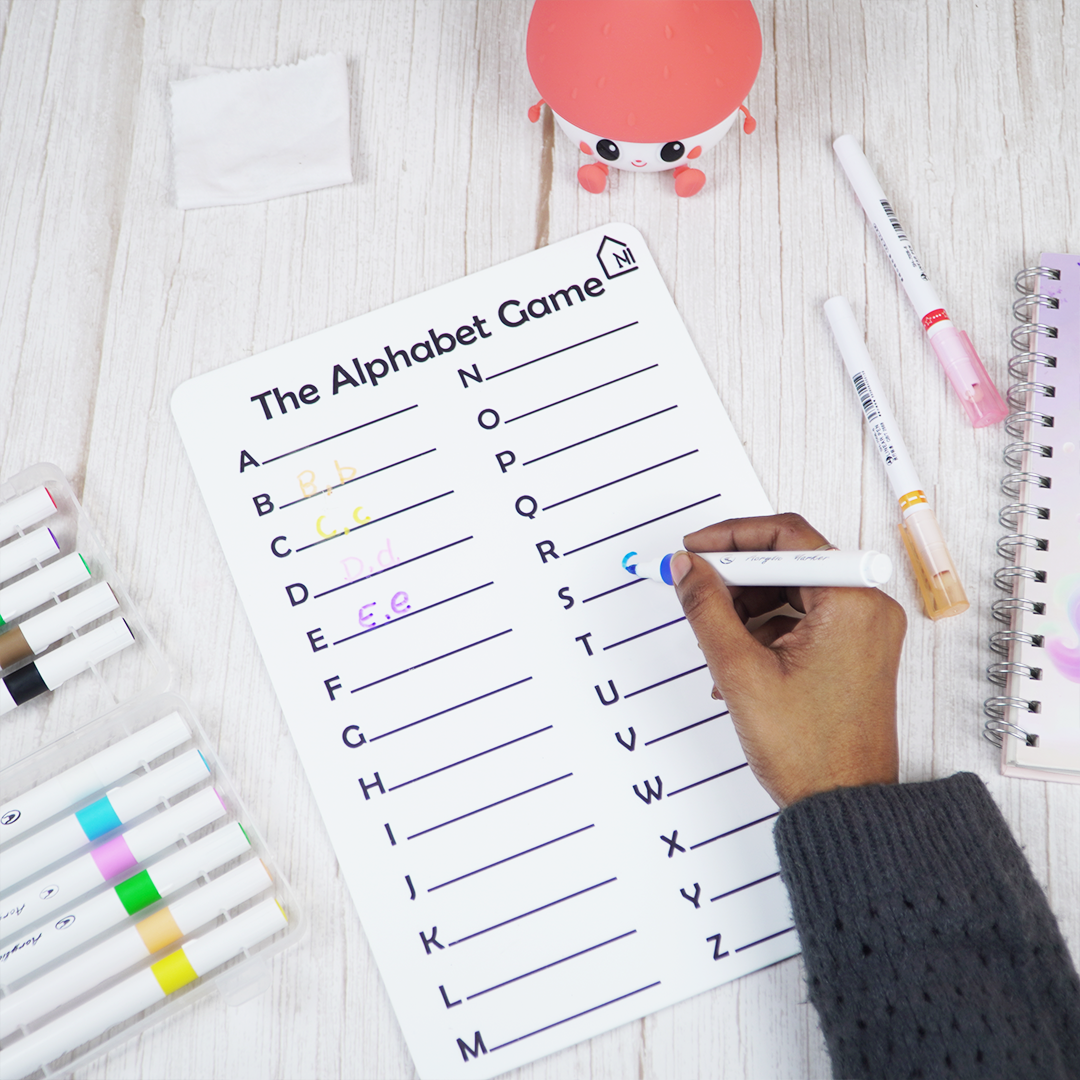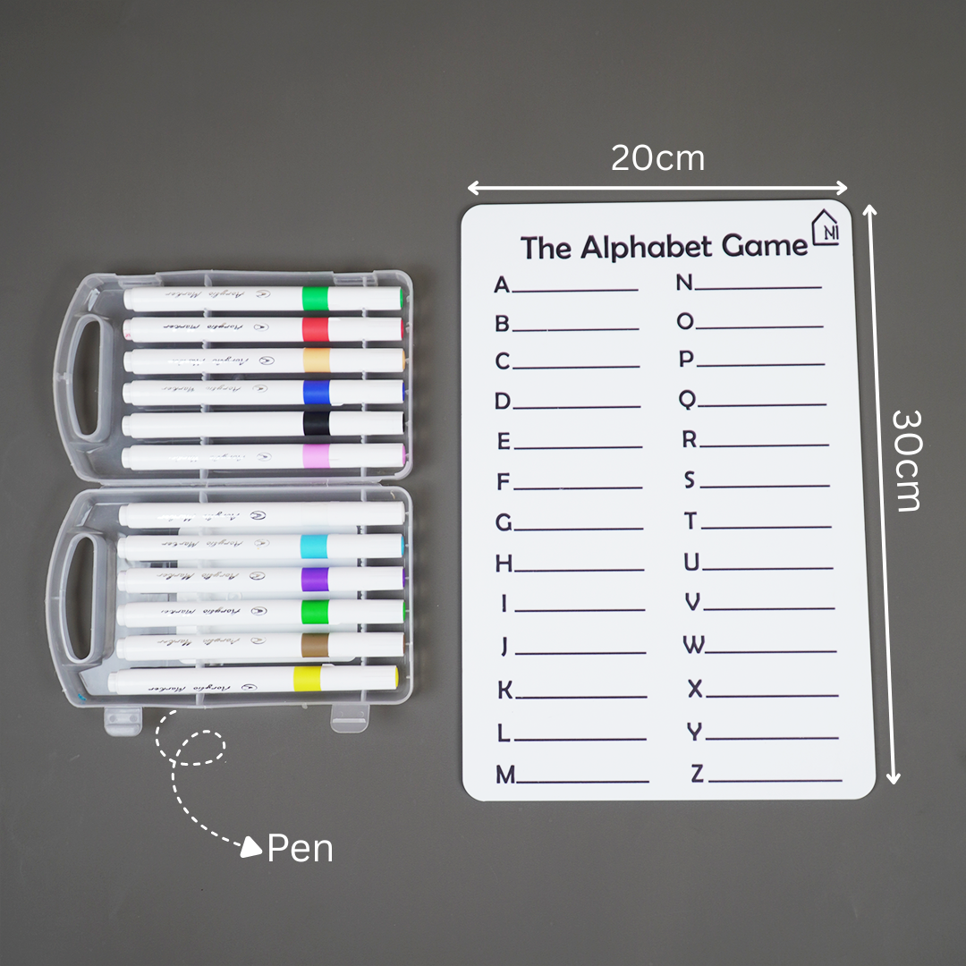 A reusable A–Z alphabet practice board that helps kids learn letters easily, with a wipe-clean surface, pen box, and cleaning cloth for mess-free daily practice.