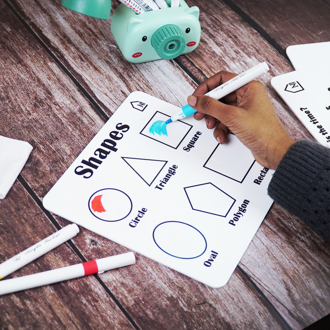 The board features essential shapes like circle, triangle, square, oval, polygon, and rectangle, helping improve shape recognition, hand-eye coordination, and fine motor skills. It comes with a pen box that neatly stores markers, making it easy to carry and organize.