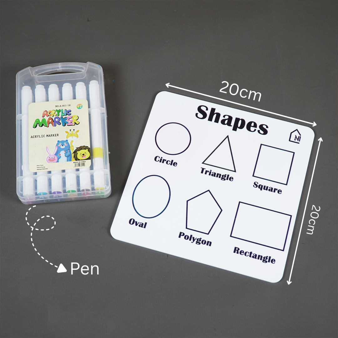A reusable 20×20 cm learning board with pen box, designed to help kids learn basic shapes in a fun and easy way—perfect for early education at home or school.