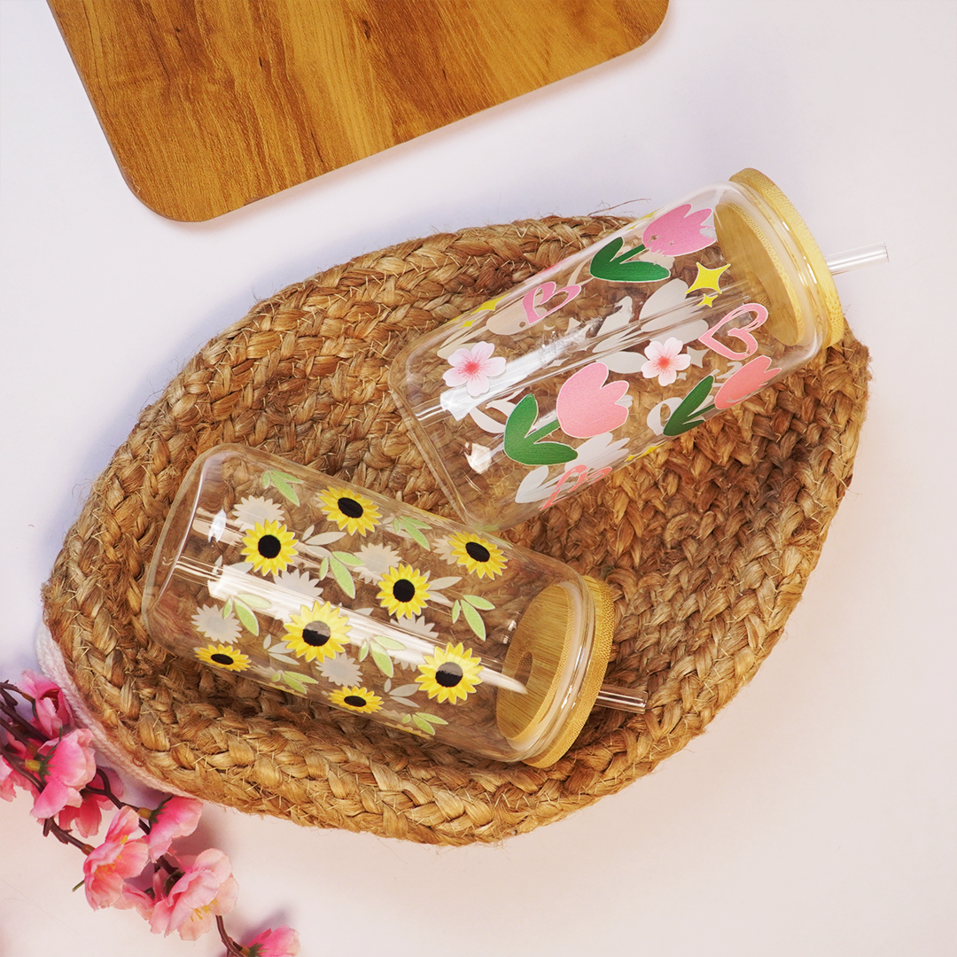 Set-2 Floral Glass Tumbler with Bamboo Lid & Straw