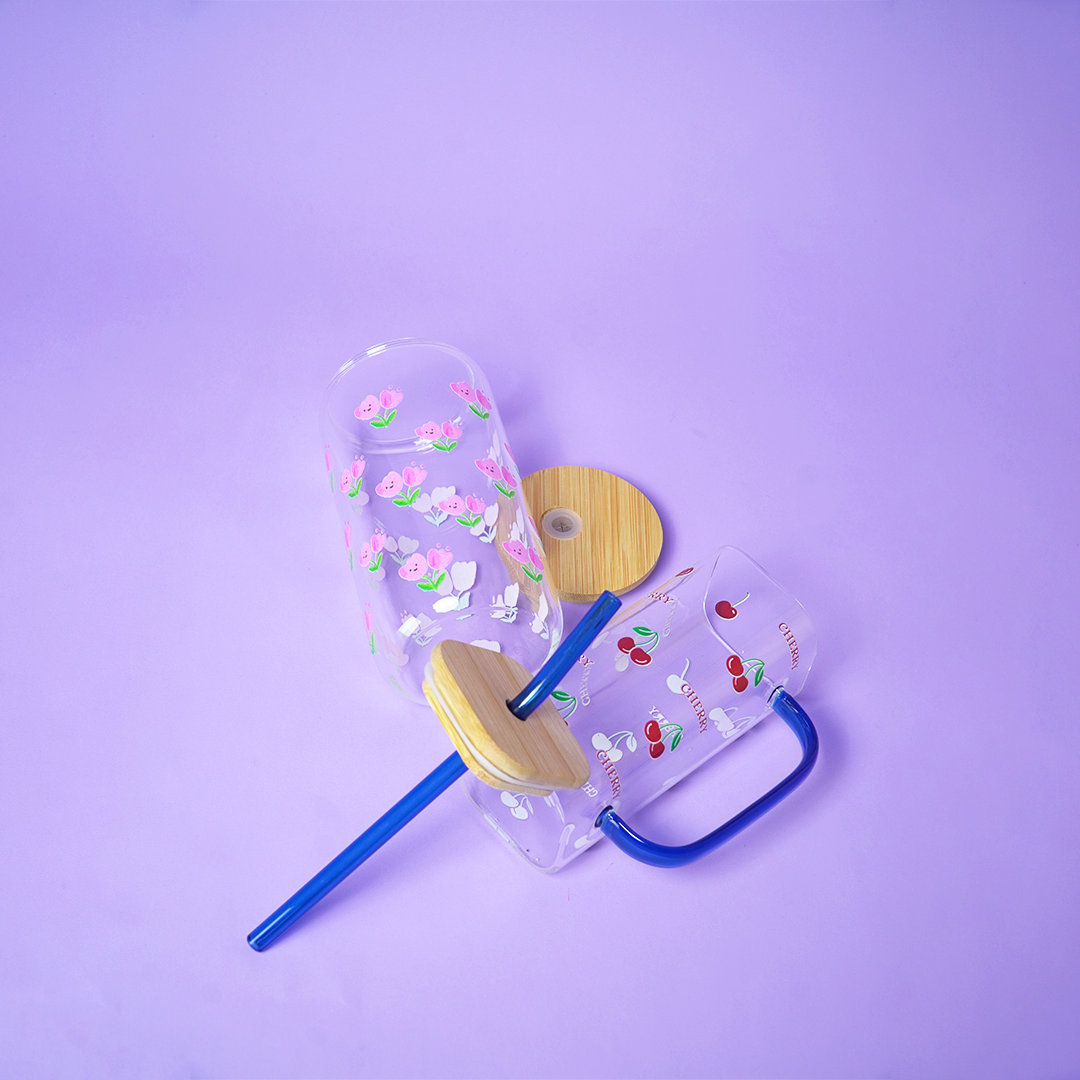 Made from premium quality clear glass, each tumbler comes with an eco-friendly bamboo lid and a durable reusable straw for your juices, iced coffees, smoothies, or mocktails. Perfect for gifting, picnics, or adding a touch of aesthetic charm to your kitchen shelf! 🌷