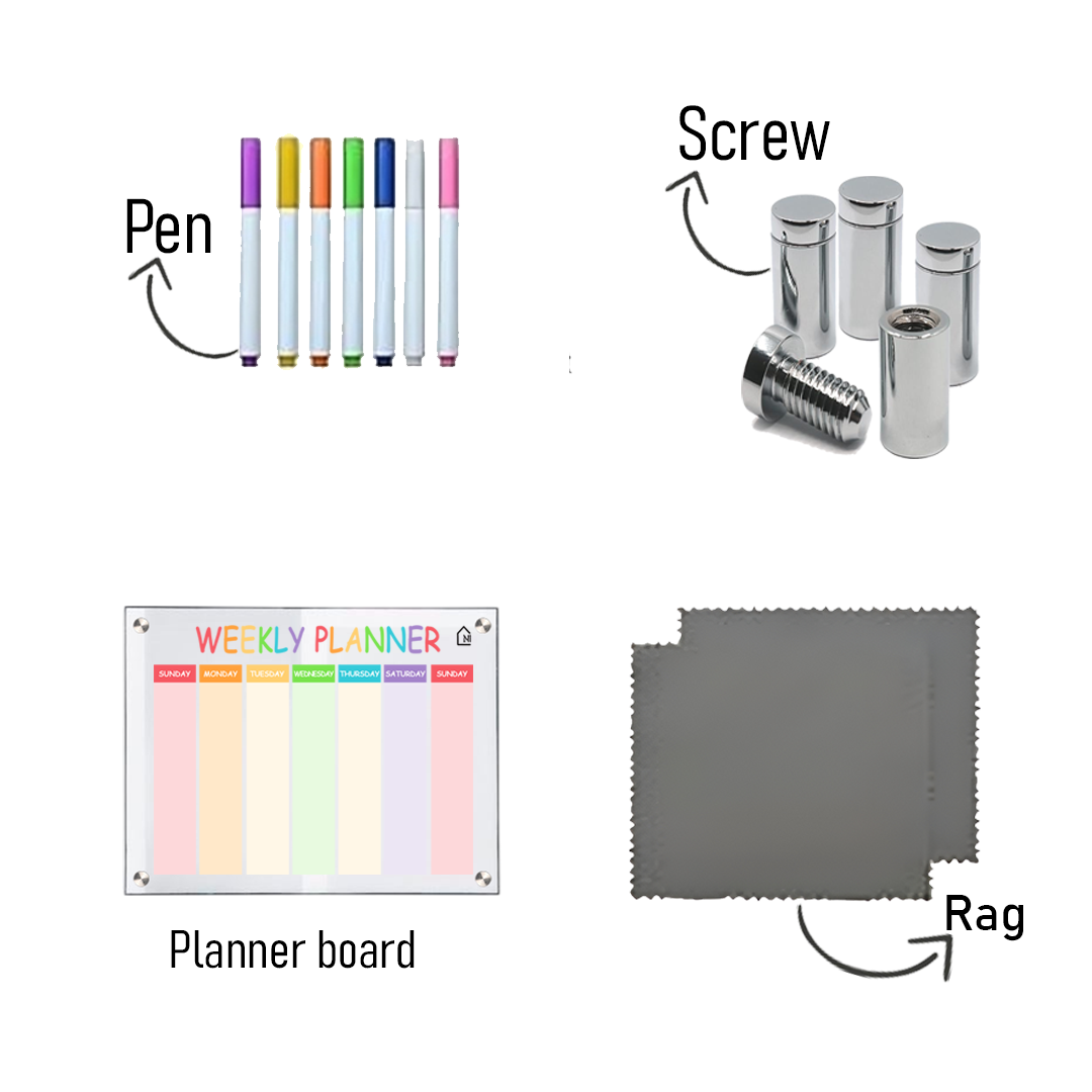 Included in Box 1× Acrylic Planner Board, Wall Mounting Kit (4 screws + hardware set)